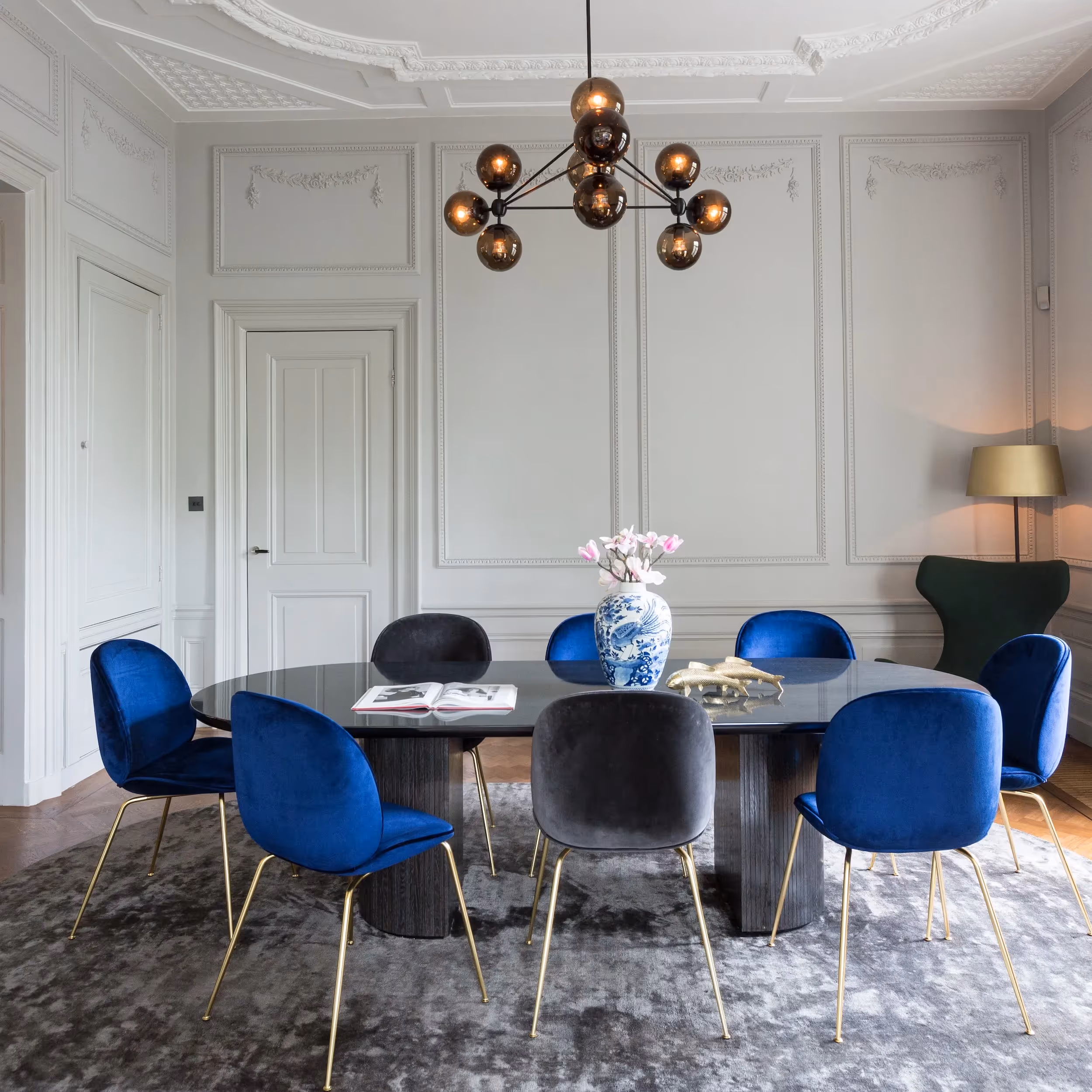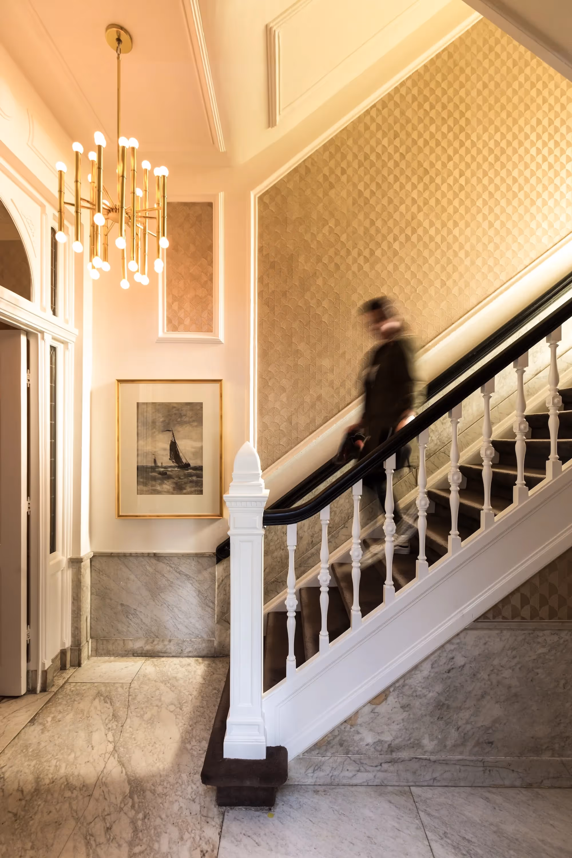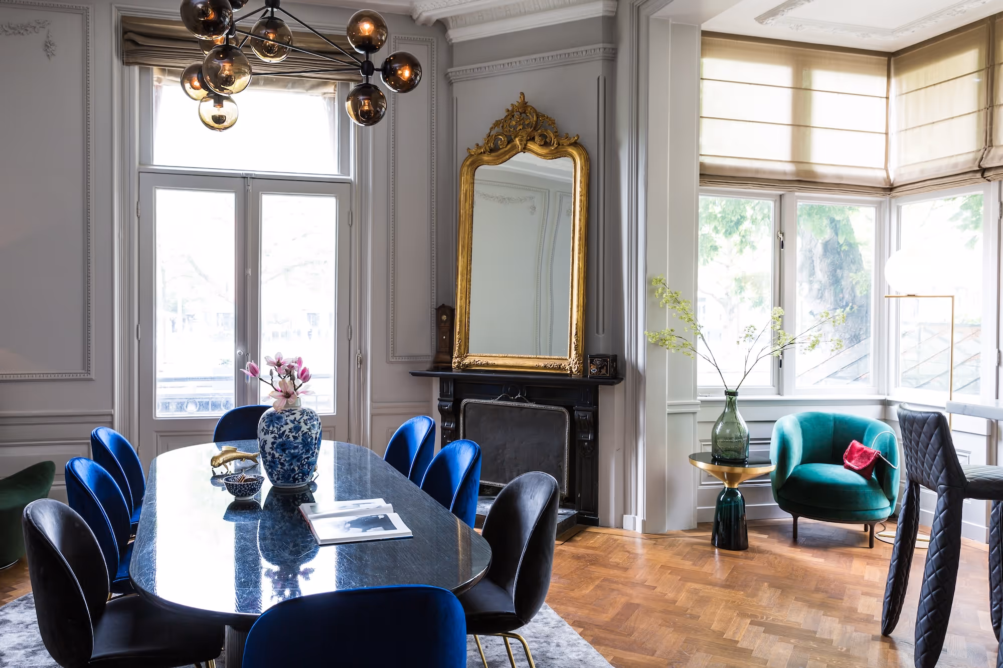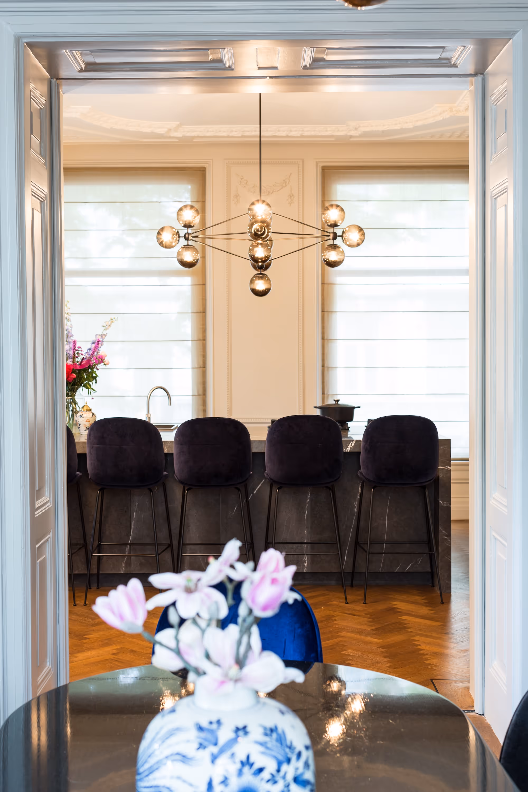 In this historic mansion on Weteringschans, RA Studio tackled the delicate task of restoring a full floor. Keeping the grandeur of the original monumental features, the design introduces sleek, modern elements while honouring the family's heirlooms. The kitchen, cleverly hidden in the walls, doubles as a bar, maintaining the seamless flow of the space.